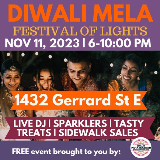 Saturday, Nov. 11, 2023, 6-10pm, Diwali Mela 2023 – Festival of Lights @Gerrard India Bazaar, 1432 Gerrard St. E., Toronto